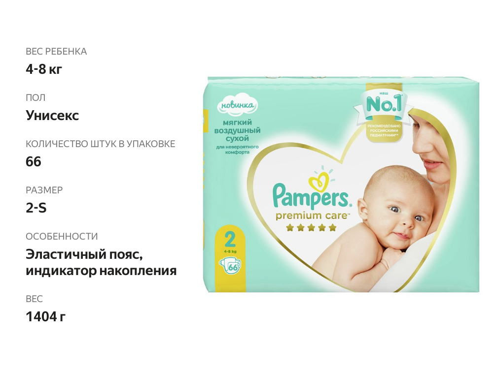 Подгузники Pampers Premium Care для малышей 2-5 кг, 1 размер, 66 шт