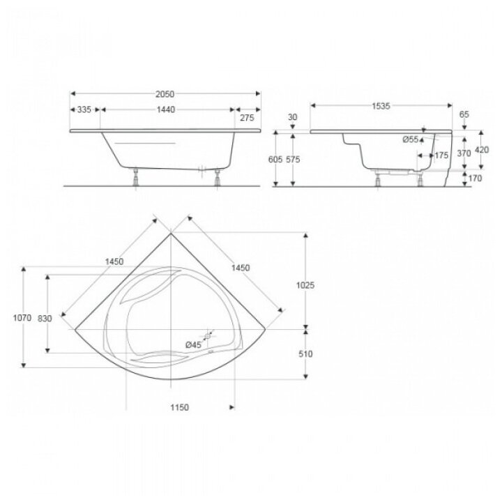 Ванна угловая 145х145 Jacob Delafon Presquile E6045RU-00