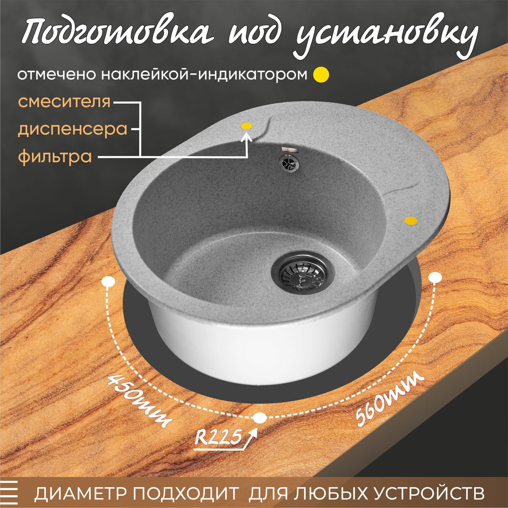 Мойка для кухни врезная каменная Dr. Gans БЕРТА-580, цвет серый, с крылом, овальная, 580х470х217 мм