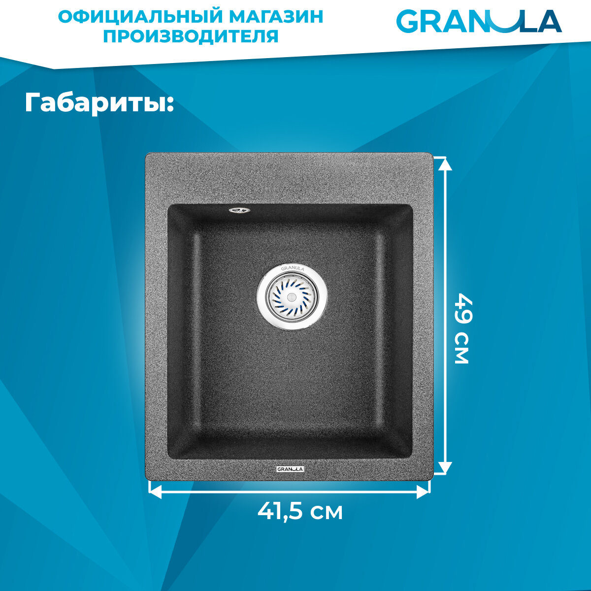 Мойка для кухни врезная кварц GRANULA 41.5x49x19.5 Кухонная раковина в комплекте с сифоном. Цвет черный металлик