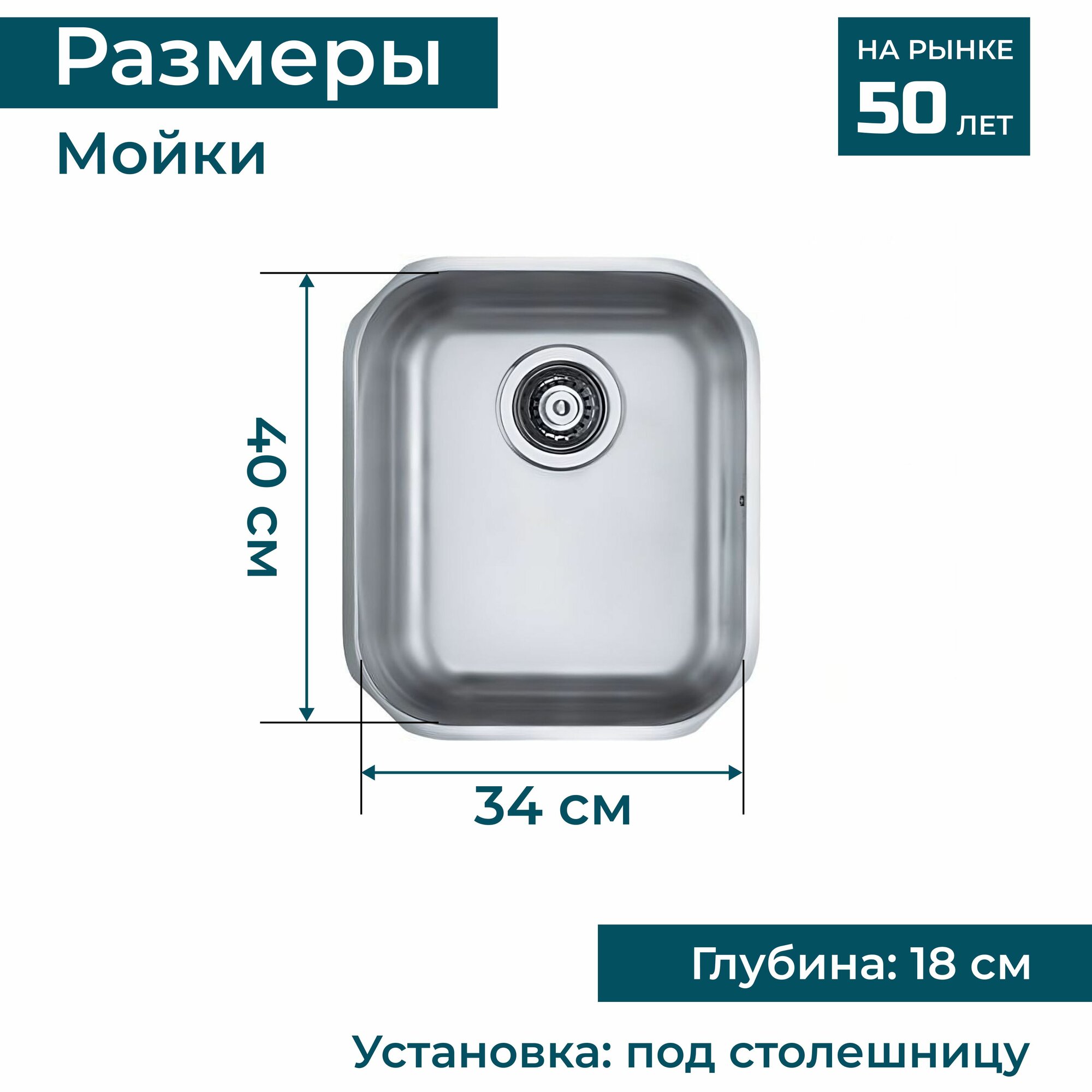 Мойка для кухни нержавеющая сталь ALVEUS VARIANT 40 SAT-90 34х40х18,5 см (слив вдоль короткой стороны) встраиваемая под столешницу с сифоном. Цвет серый металлик
