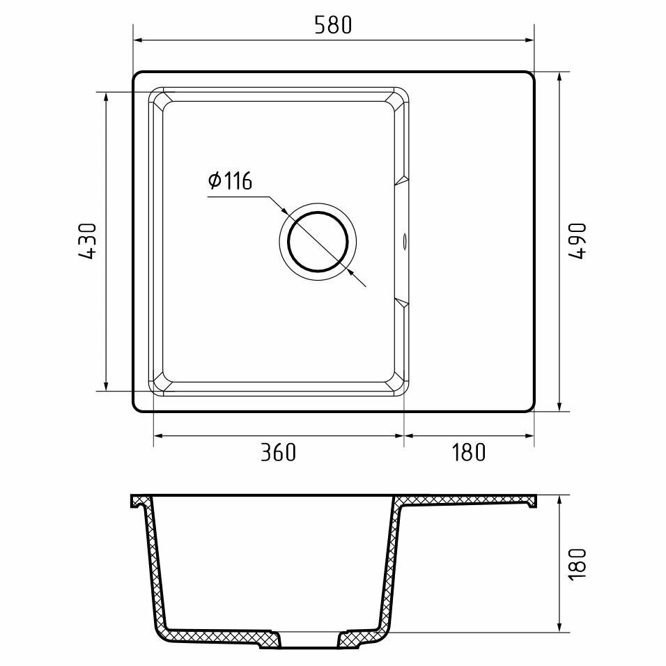 Мойка кухонная врезная, GranFest, Urban, кварцевый песок, 580х490 мм, 1 чаша+крыло, черная, GF-UR-658L