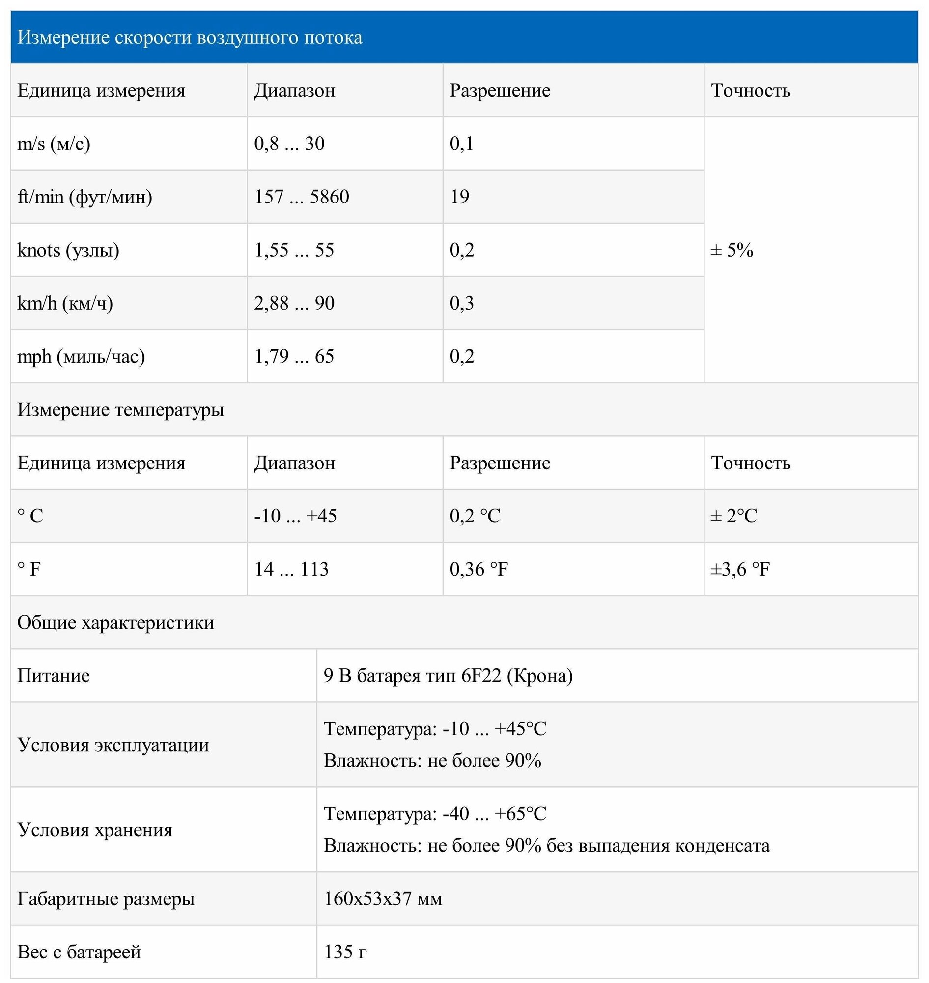 | Поддержка единиц измерения | °C / °F / км/ч / м/с / миля/ч / узлы / фут/мин |