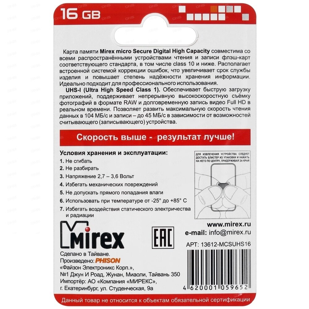 Память microSD 16Gb Mirex 13612-MCSUHS16 .