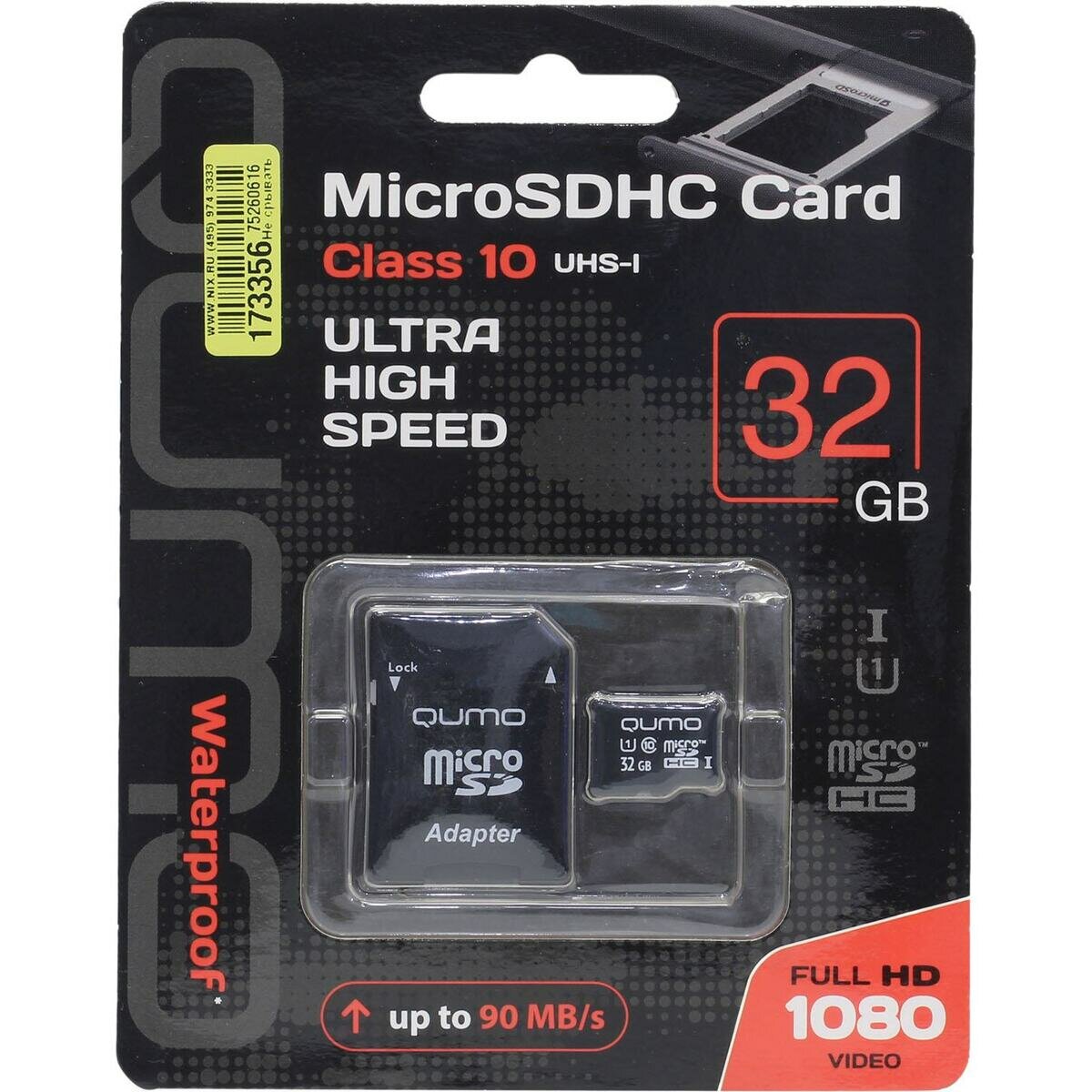 Карта памяти microSDHC Qumo QM32GMICSDHC10U1 32 Гб класс 10 UHS-I - 90*10 МБ/с FULL HD 1080 Video - с адаптером SD