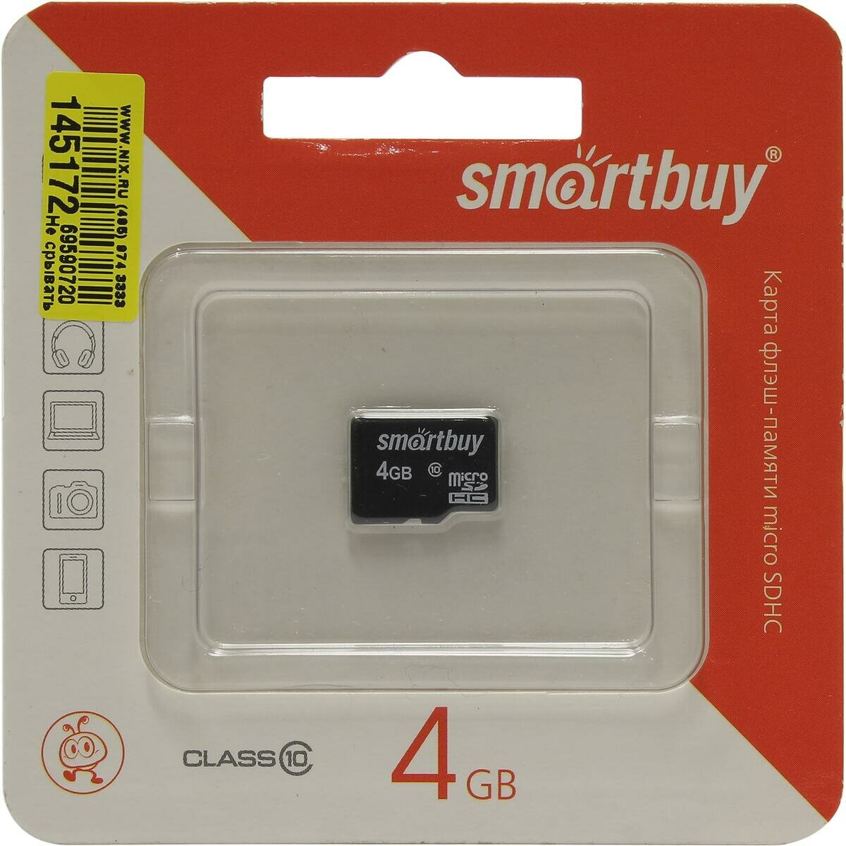 Карта памяти SmartBuy microSDHC 4 ГБ Class 10, R/W 25/14 МБ/с, черный