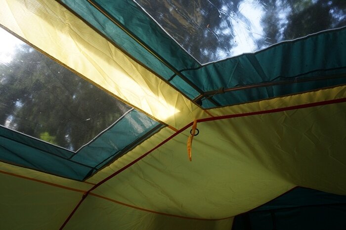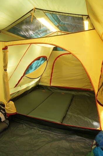 | Отзыв: | Палатка специфическая, так как почти нет предбанника. По всему объему идет внутренняя палатка с двумя комнатами и только с торцов маленькие предбанники для обуви и посуды. Обычно на ночь расходились по два три человека на каждую комнату, а днем спальники переносили в одну из комнат, а во второй делали комнату отдыха и столовую. Лето выдалось холодное, поэтому палатка постоянно была прикрыта и вентиляция шла через боковые окна. Конденсат был только на тенте, во внутренней палатке всегда сухо и относительно тепло. Наличие юбки спасало от дождя и главное ветра. Ветер с реки донимал всех у кого были палатки без юбки. Палатка здоровая, но устойчивая даже при сильном ветре если закрепить все оттяжки. Несколько раз снимали внутреннюю палатку совсем. Получалась комната в 18 квадратных метров для столовой. Один раз загоняли машину под тент когда ждали град. |