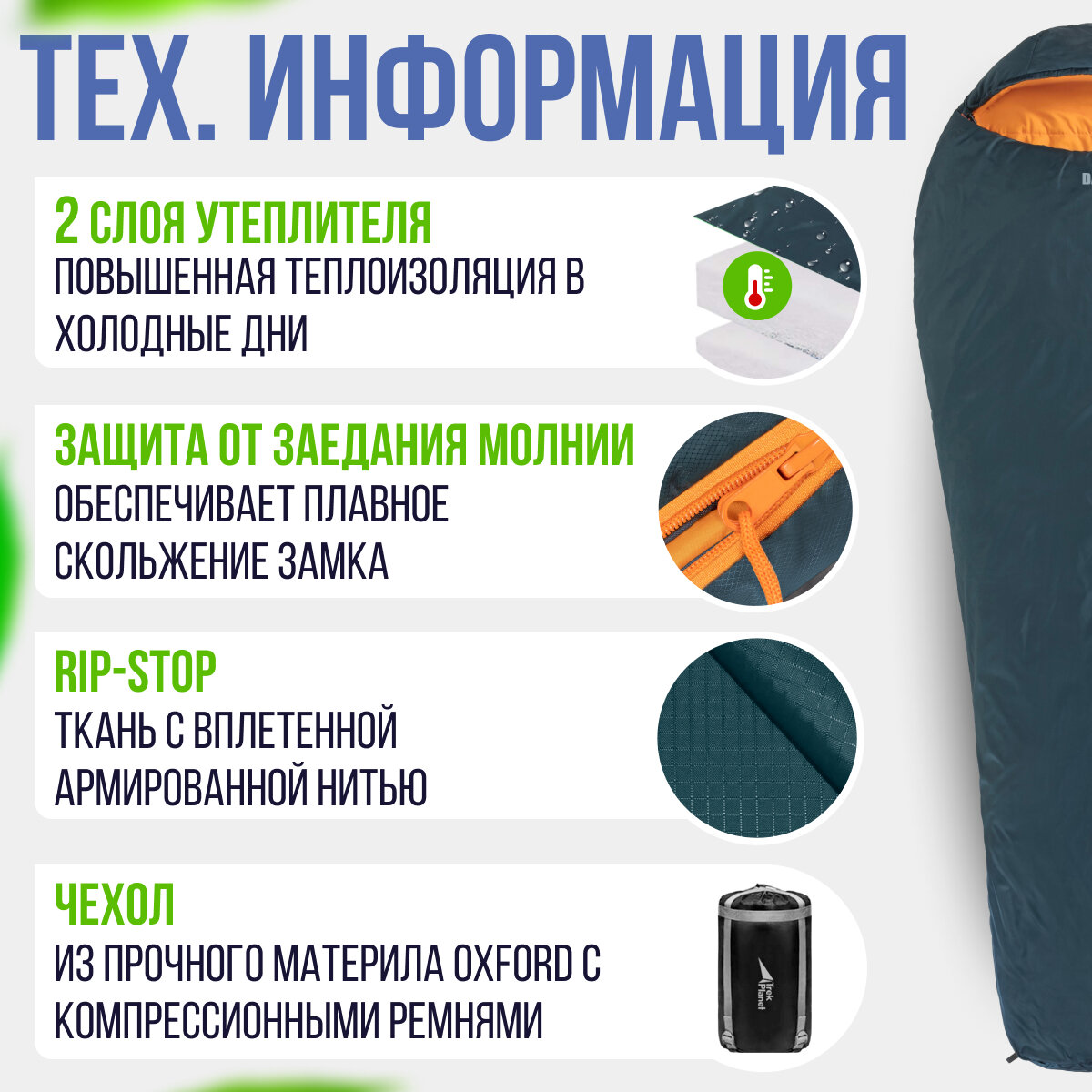 | Минусы: | компрессионный чехол утягивает спальник только в одном направлении,