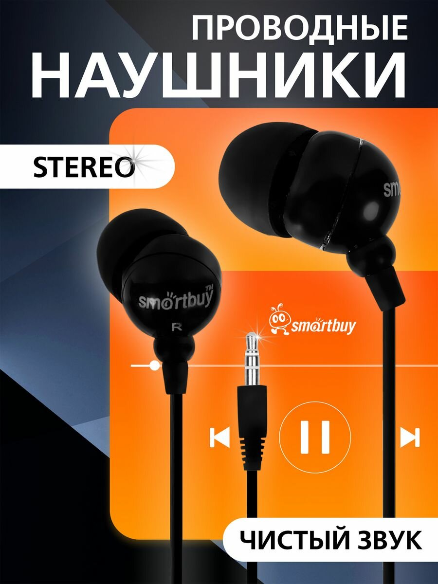 Наушники-вкладыши SmartBuy "Color Trend", проводные, 1,2 м, черные (SBE-1100)