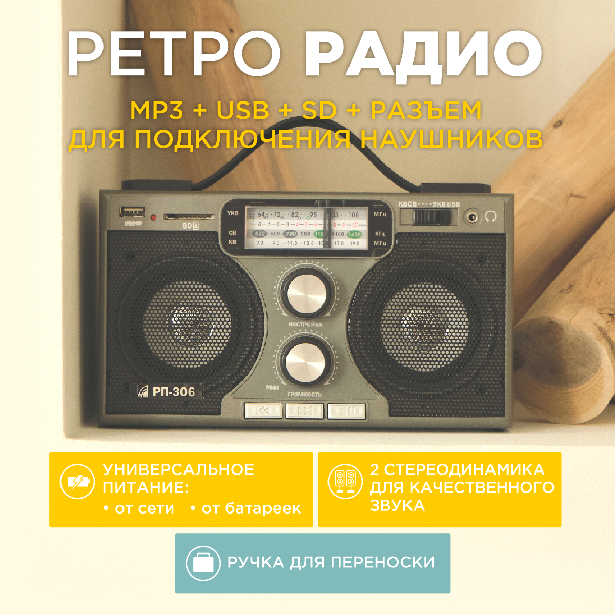 Радиоприемник БЗРП РП-306, УКВ/СВ/КВ, 4xR20, 220V, USB,SD,стерео, ручка, 22x13.3x13.5 см.