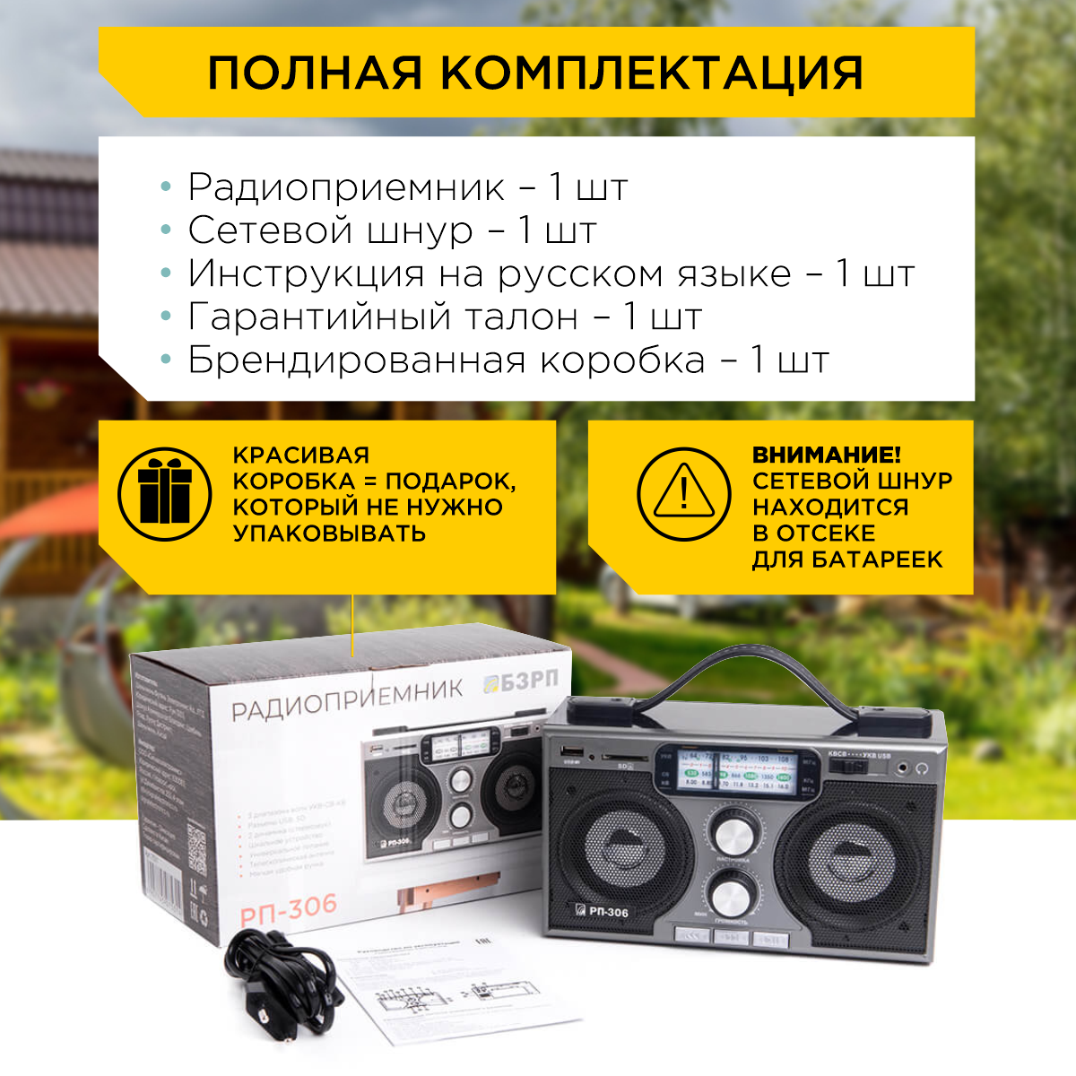Приемники Сигнал Радиоприемник "БЗРП РП-306", УКВ 64-108МГц, бат. 4*R20 (не в компл.), 220V, USB, SD, 2динамика, моно