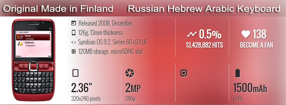 | Плюсы: | Качество материалов корпуса (со времен 7110 Нокиа наконец-то уделила материалу корпуса пристальное внимание), мощный аккумулятор (большое время в режиме ожидания), удивительное соотношение цена/качество (попробуйте найти телефон с WiFi на борту и QWERTY-клавиатурой при цене менее 8000руб.) |