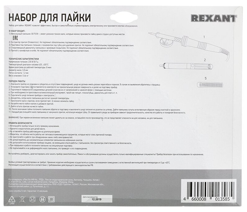 Набор для пайки №5 (паяльник импульсный 30/70Вт, оловоотсос, подставка, припой) REXANT