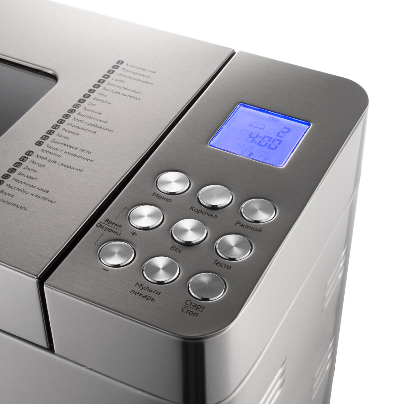 Стильный металлический корпус. Выбор веса выпечки (500, 750 или 1000 грамм). Три автоматические программы для светлого, среднего и тёмного цвета корочки.