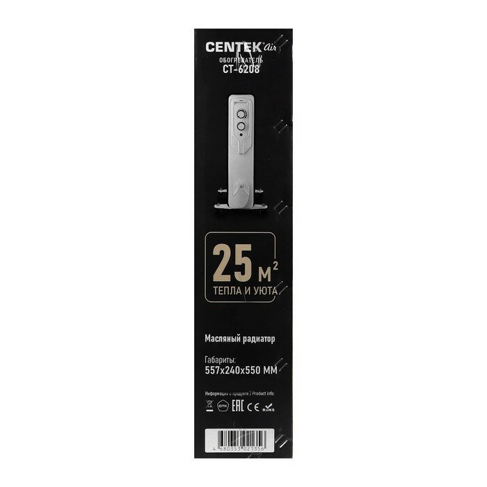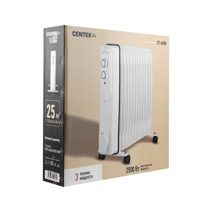 Обогреватель электрический масляный CENTEK CT-6208: белый, 13 секций, 25м2, 2500Вт, 3 режима, защита от перегрева, терморегулятор, LED-индикатор
