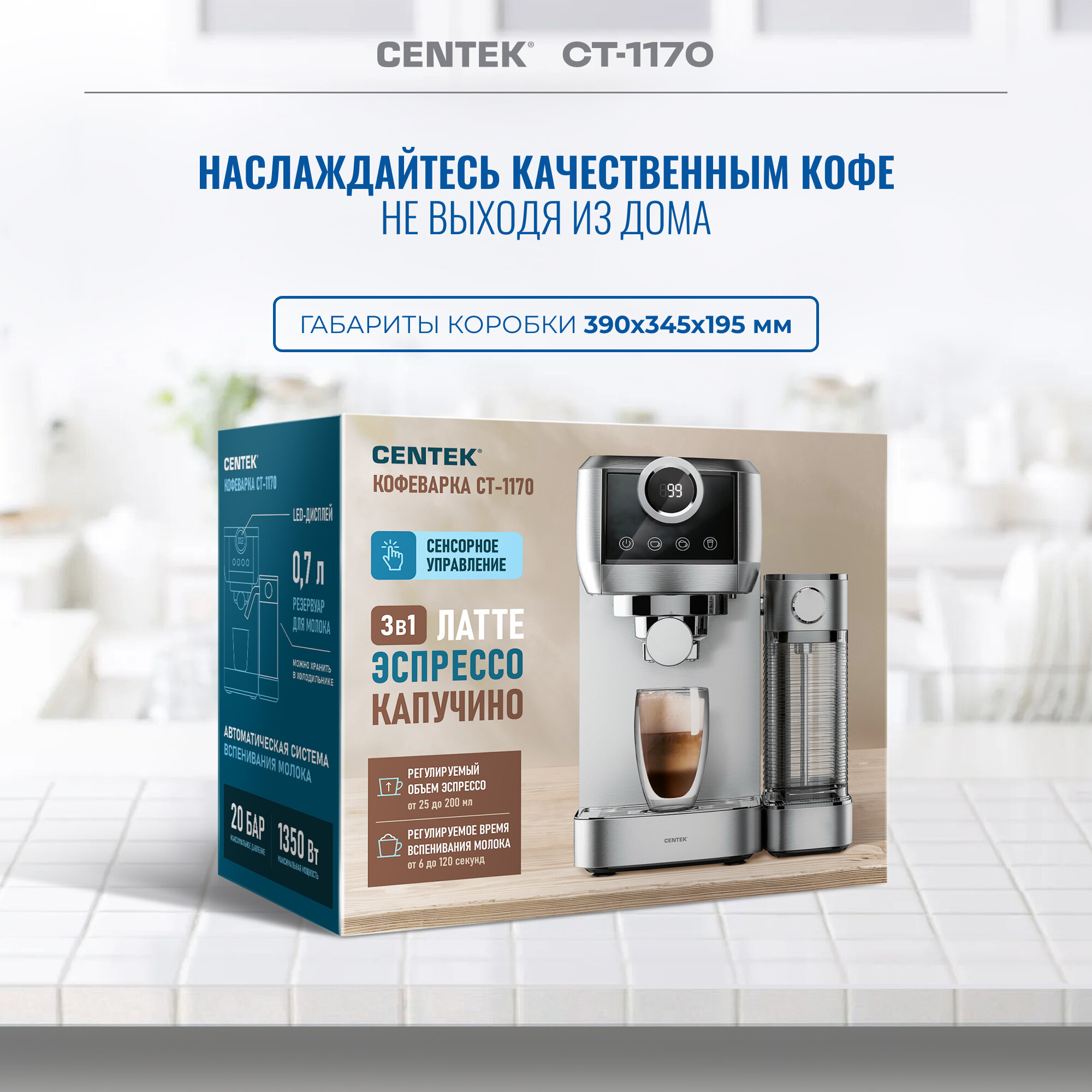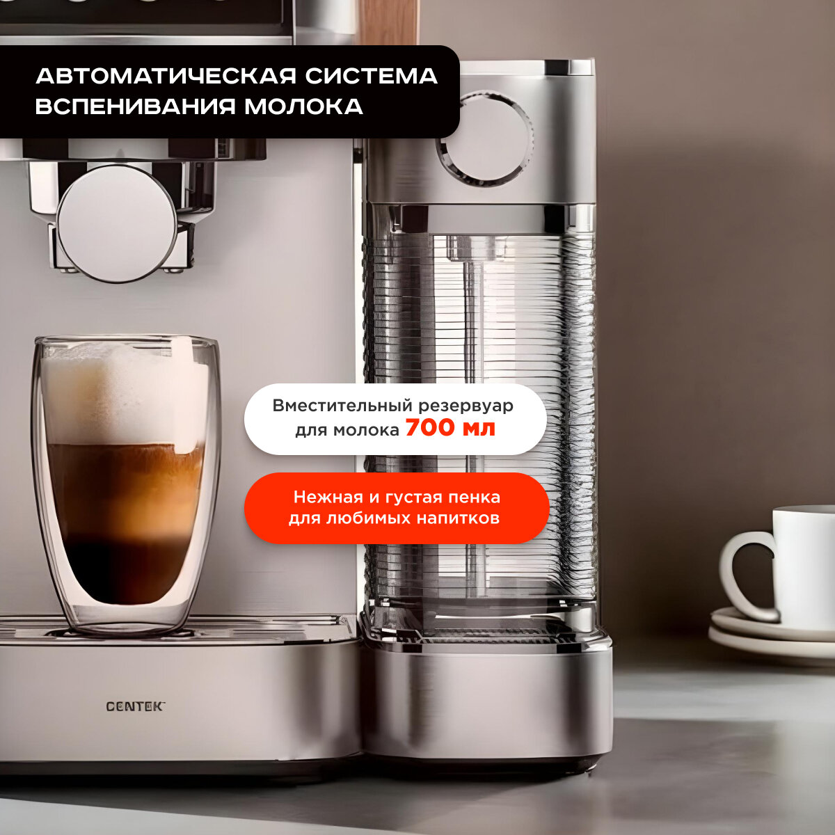СохранитьКофеварка рожковая CENTEK CT-1170, 1350 Вт, объем 1,3 л, 20 бар, автоматический капучинатор, серая интересное: