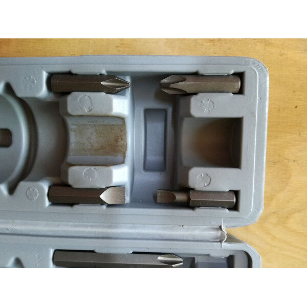 | Минусы: | Хрупкость бит, и при каждом ударе сползает резиновая защита. Также мягкий метал ручки, деформируется при ударах молотком |