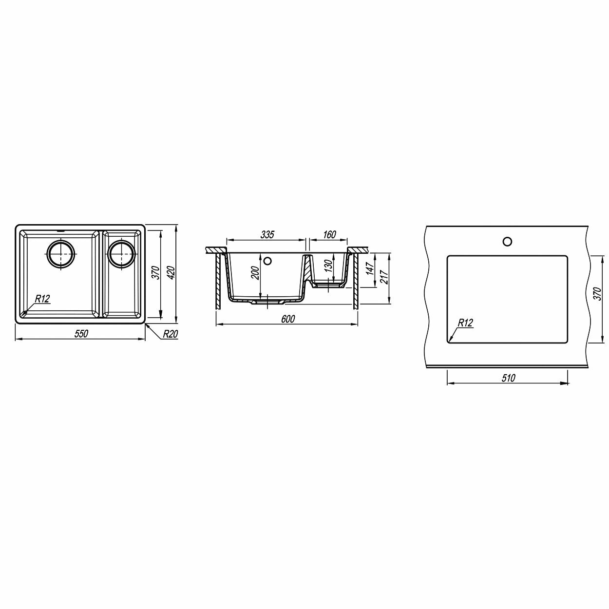 Мойка для кухни подстольная каменная Florentina ВЕГА-335/160, цвет антрацит, прямоугольная, двойная, 550х420х217 мм