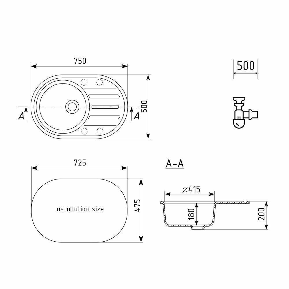 Мойка кухонная мраморная ULGRAN U-500 440мм круглая (308) черный/Раковина для кухни