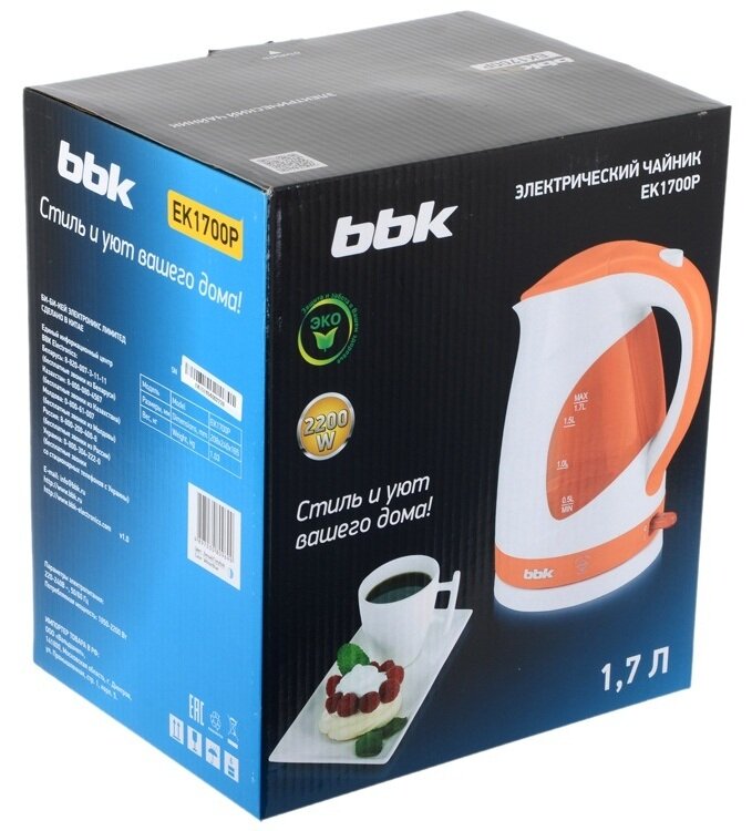 Чайник пластиковый 1,7л BBK, 2200Вт, белый/оранжевый, арт. EK1700P