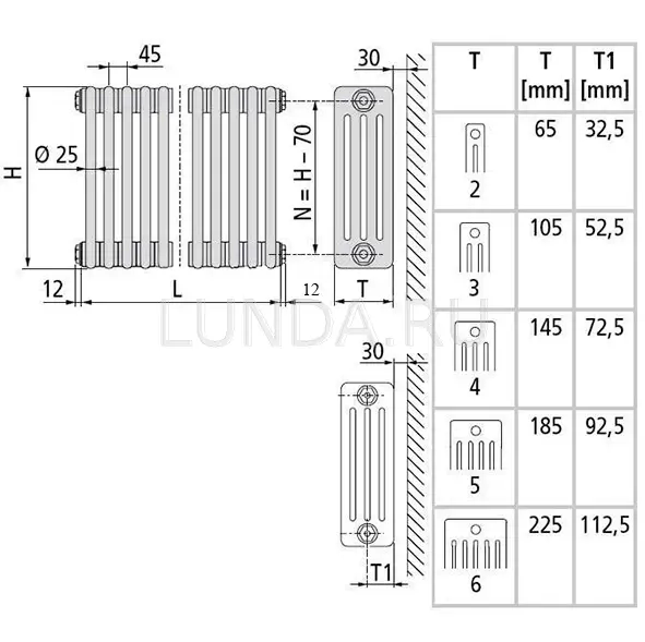 Радиатор трубчатый Arbonia 3030, подключение №69, 30 секций. (3030/30 № 69 ventil oben RAL9016)