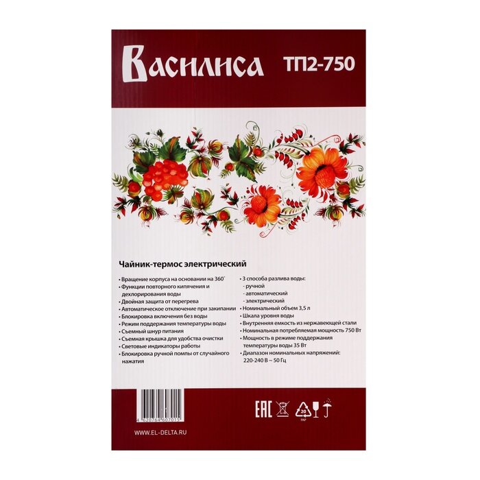 Чайник-термос 3,5 л василиса ТП2-750 "узоры" : 750 Вт, 3 способа подачи воды .