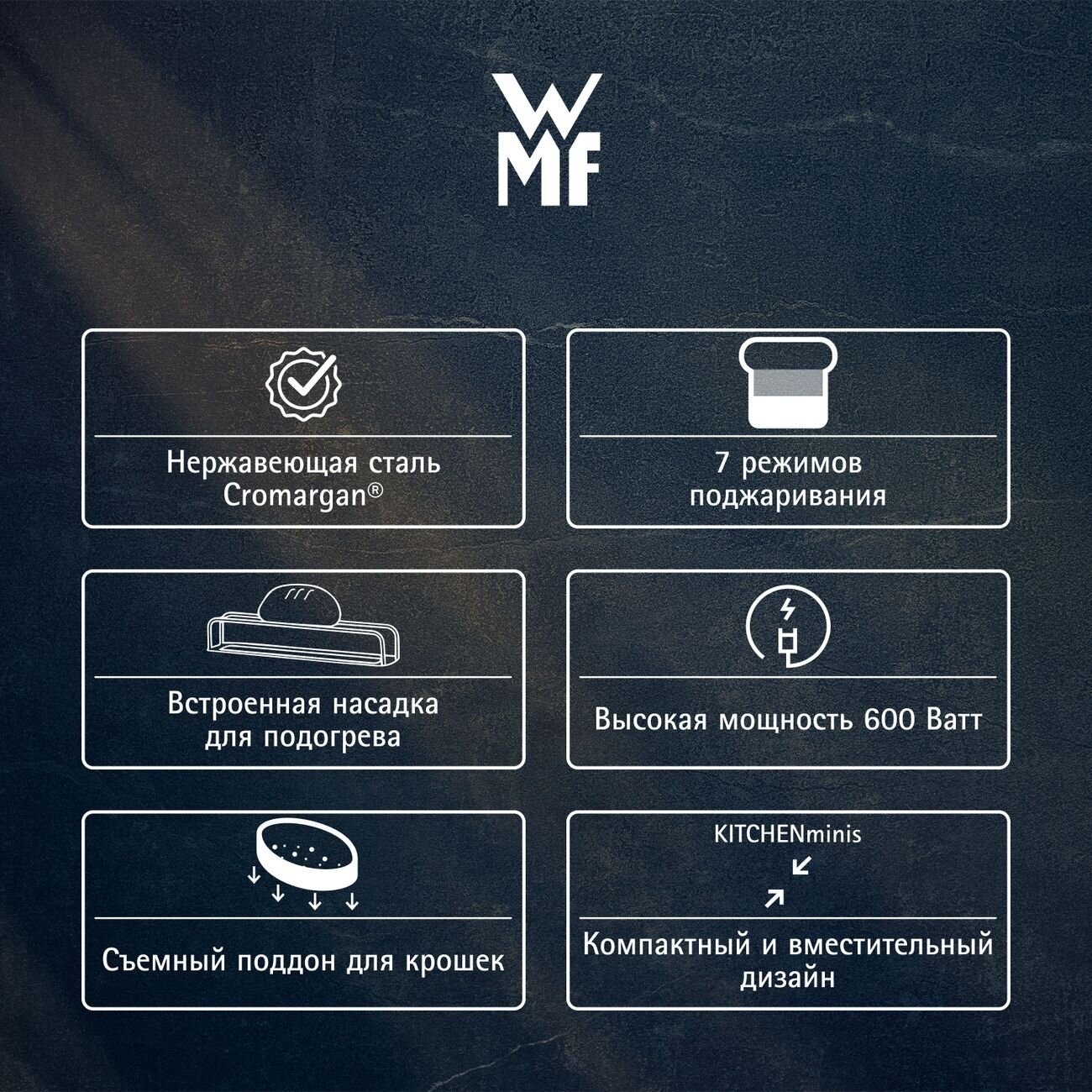 Тостер WMF KITCHENminis, 1 слот, 7 режимов поджаривания, нержавеющая сталь Cromargan, 600 Вт, серебристый интересное: