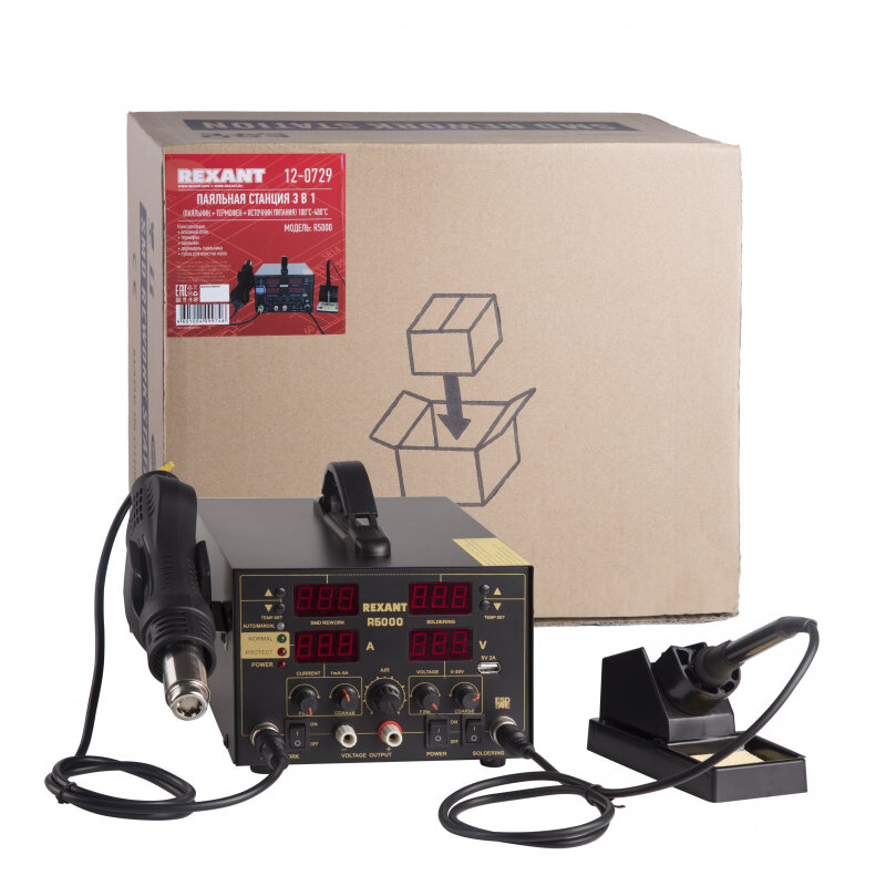 Станция паяльная, 3 в 1: паяльник+термофен+источник питания 12-0729 REXANT 12-0729