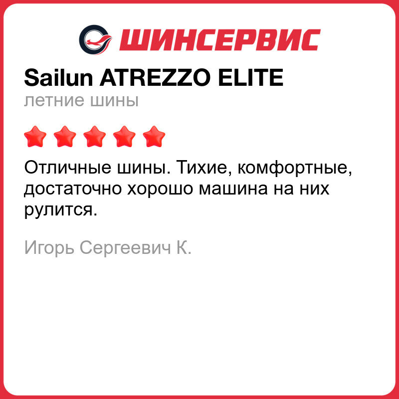 | Отзыв: | Модель SAILUN Altrezzo Еlitе достойная. Не носит на мокрой дороге, торможение отличное, в поворотах машину держат нормально. Нет вопросов и к износоустойчивости. Я рекомендую. |