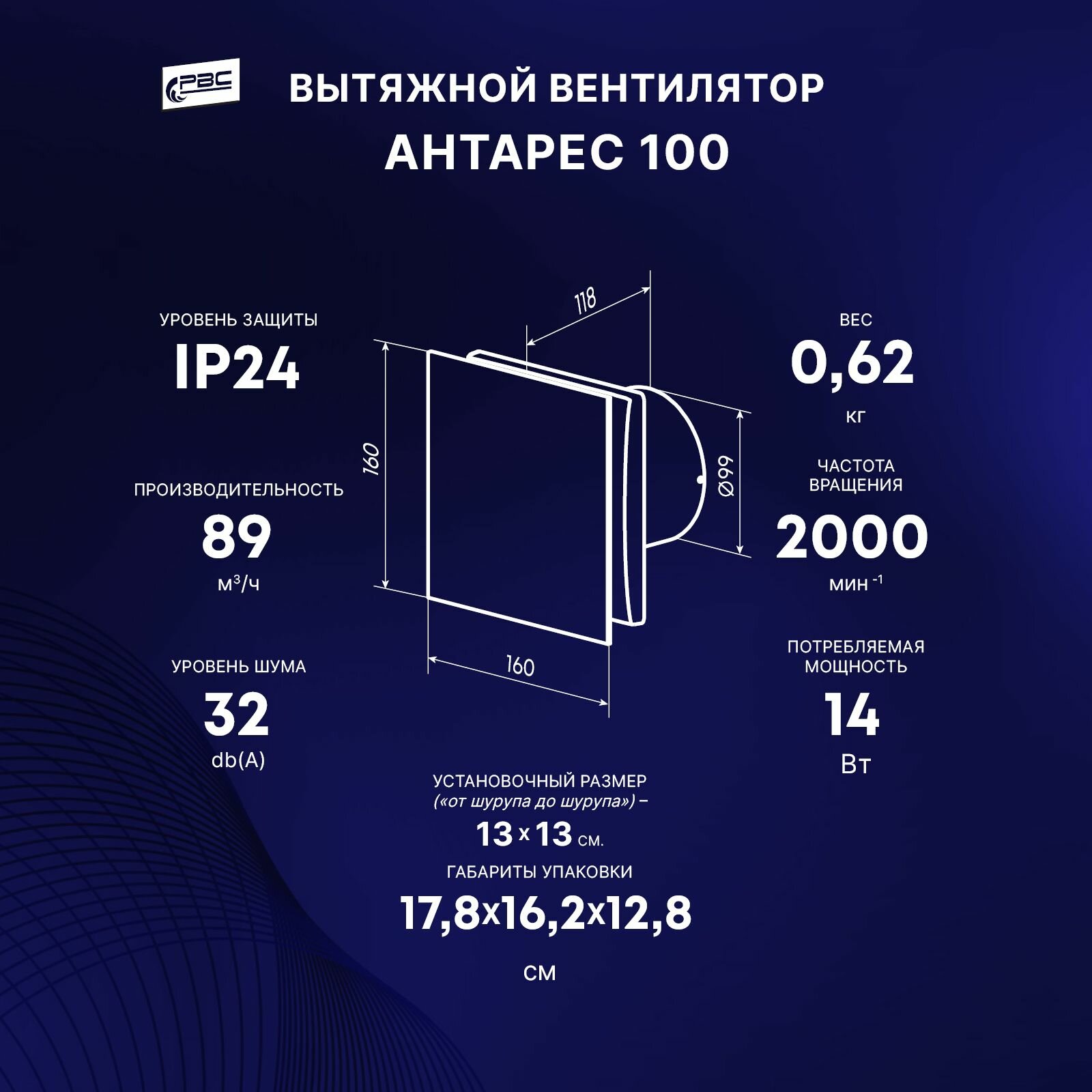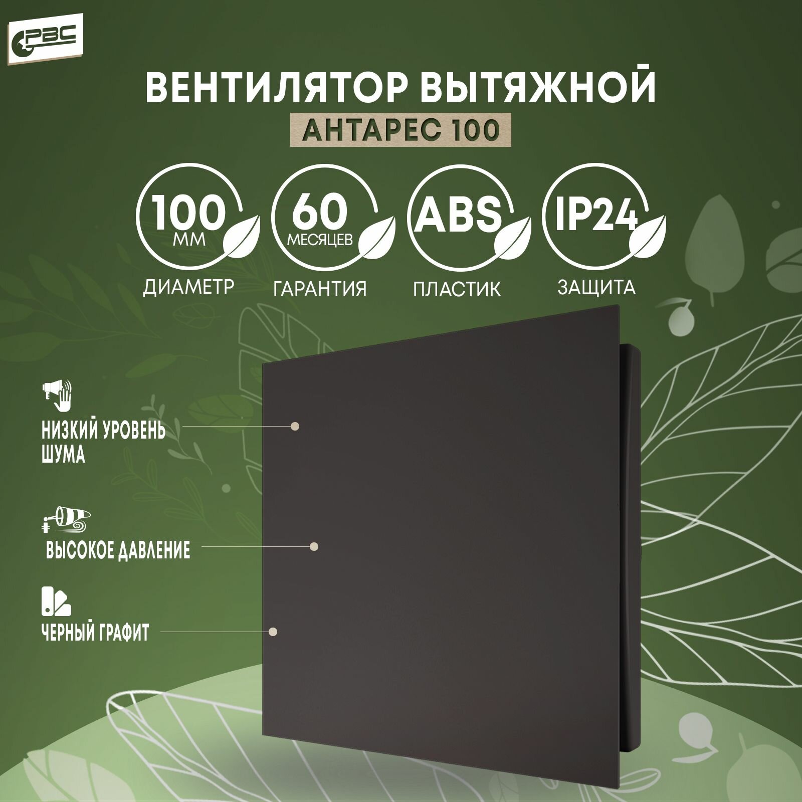 Вентилятор вытяжной с декоративной панелью РВС Антарес 100 Турбо (повышенной мощности), 16 Вт, 37 дБ, 116 м3/ч, черный графит