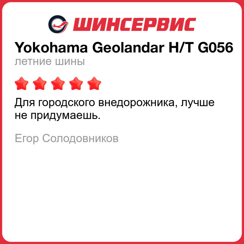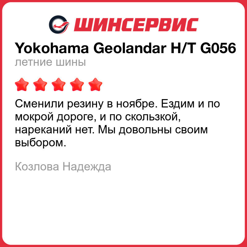 | Отзыв: | Хочу поделиться опытом эксплуатации покрышек Yokohama Geolandar H/T G056. Откатал всего сезон, по итогу могу отметить хорошую износоустойчивость, протектор практически как новый. Хорошо держат дорогу как посуху так и в дождь, в поворотах не сносит, неглубокие лужи проходит уверенно без какого либо намёка на аквапланирование.