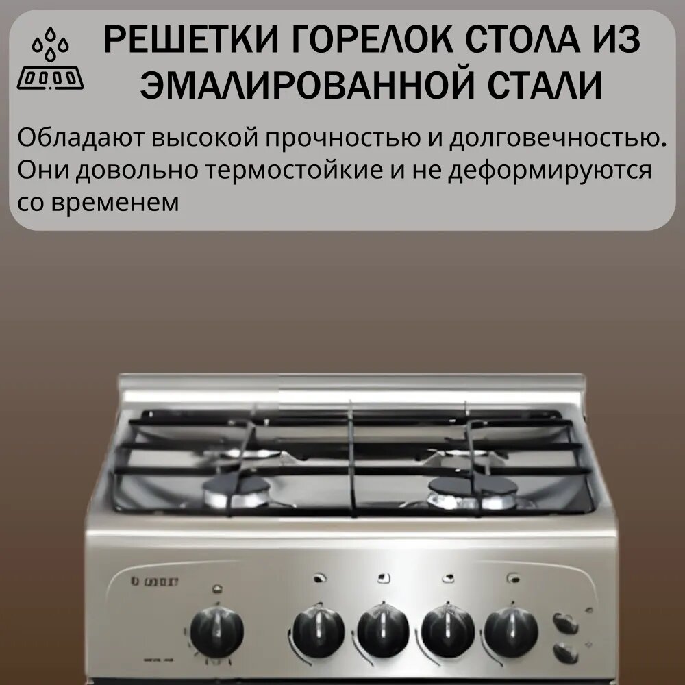 | Минусы: | Неудачная решетка над комфорками, можно завалить на бок посуду.
