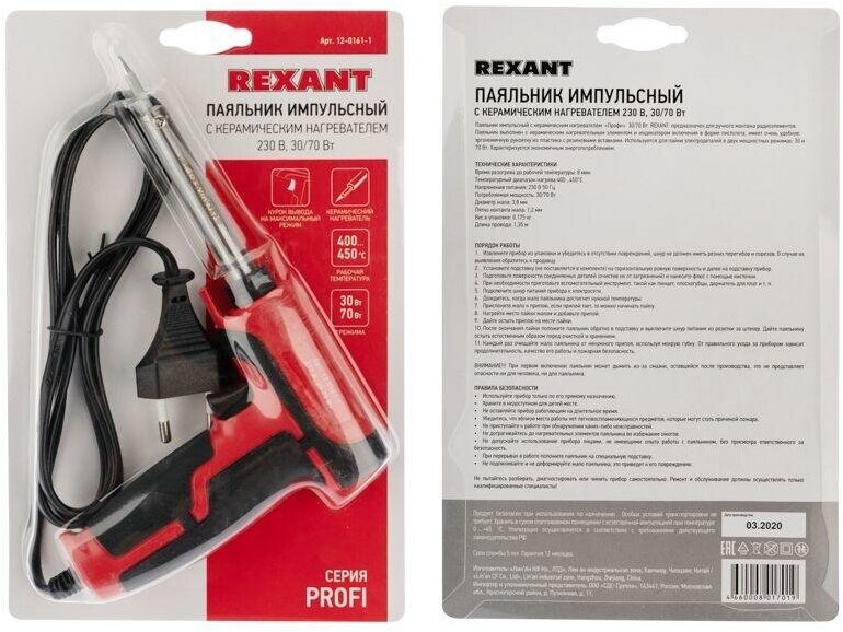 Паяльник импульсный с керам. нагревателем 220В 30-70Вт (ZD-722B) REXANT 12-0161-1 (1 шт.)