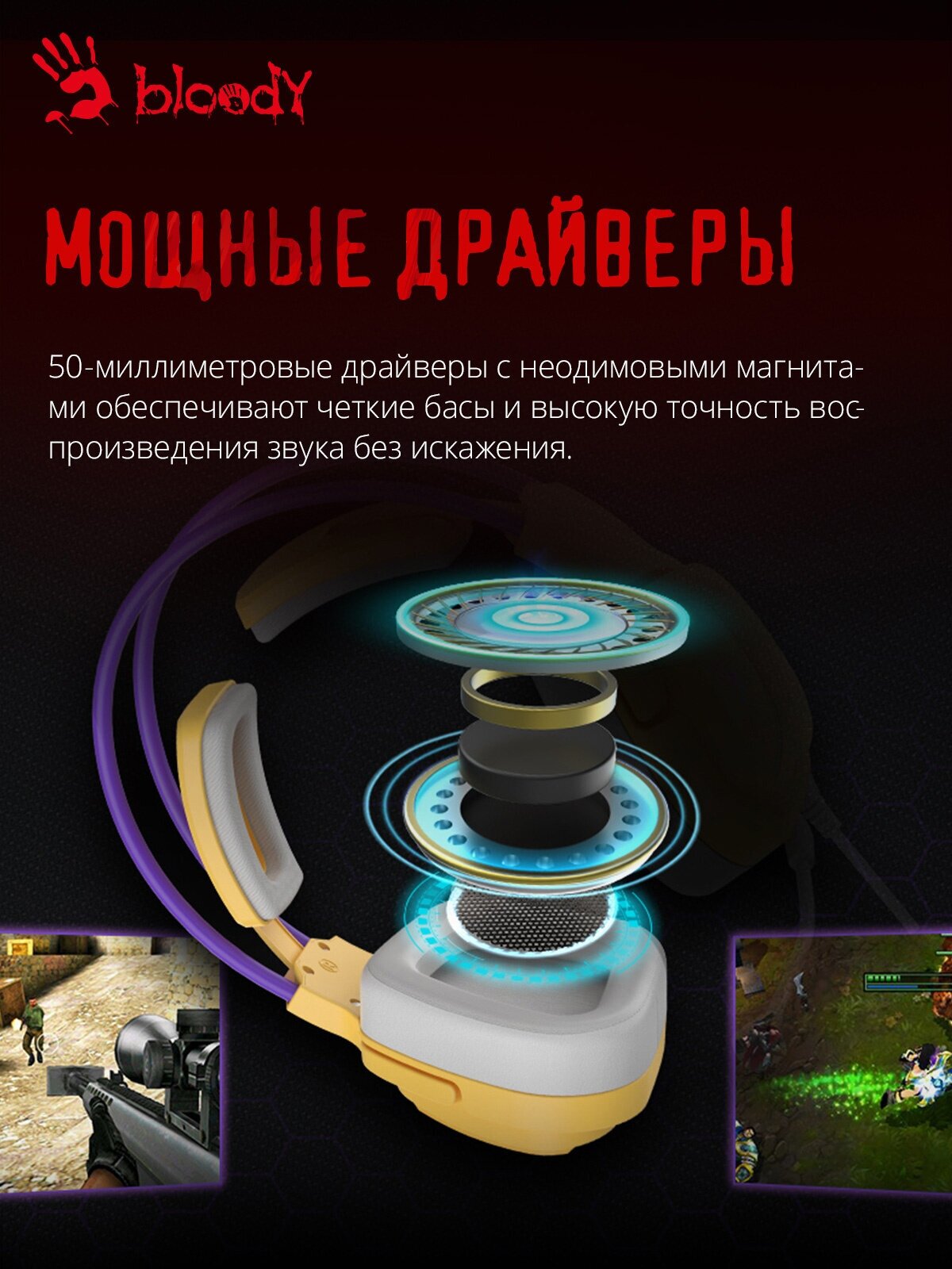 СохранитьГарнитура игровая A4TECH Bloody G575, для компьютера, мониторные, проводные, желтый / фиолетовый [g575 /royal violet/ usb] интересное: