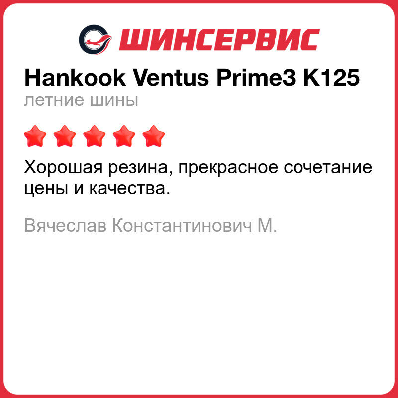| Отзыв: | У всех людей разные требования к свойствам покрышек.Всегда искал комфортную резину,и всегда выходило компромиссное решение.Короче говоря,Hankook Tire Ventus Prime3 решает!!! |