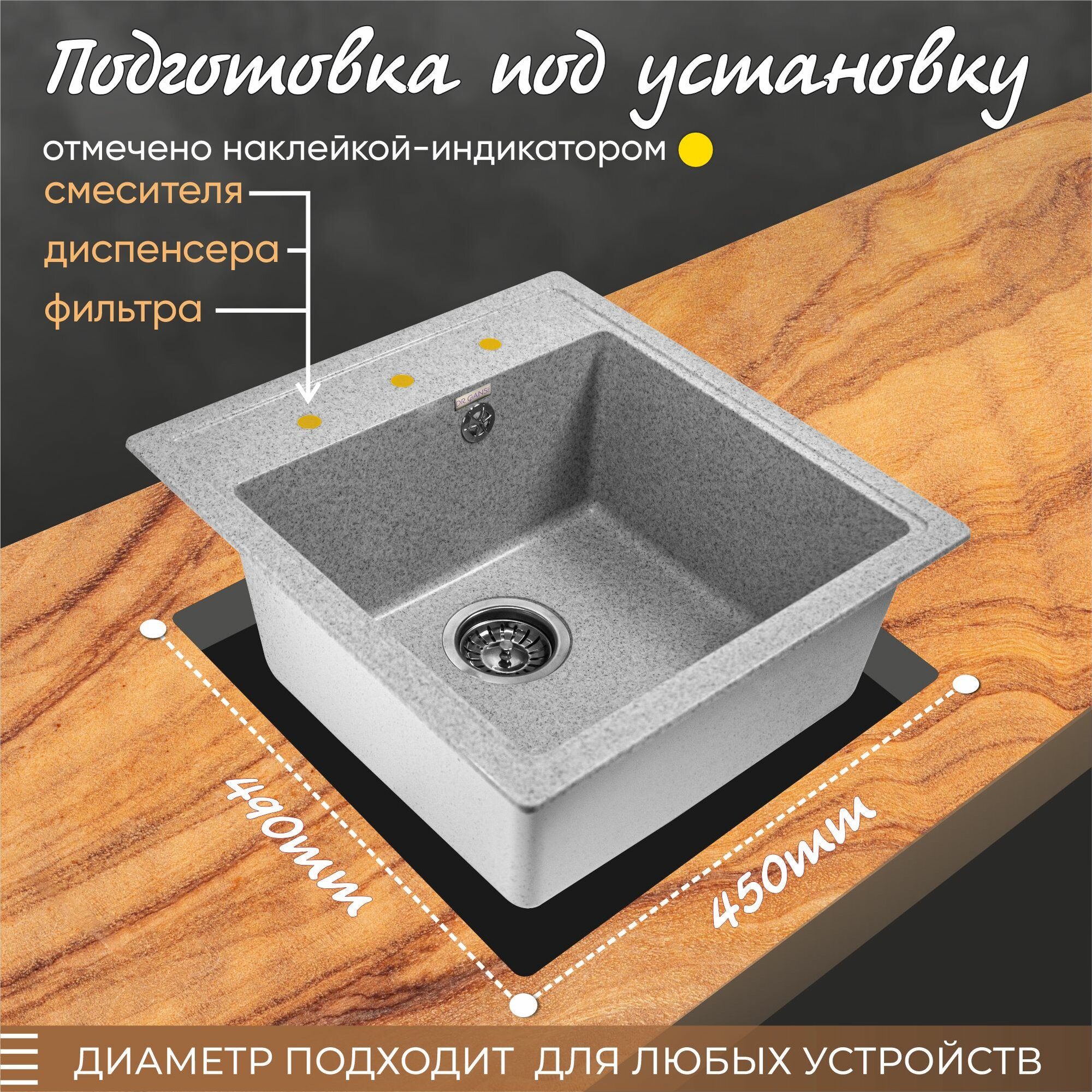 Мойка для кухни врезная каменная Dr. Gans НИКА-470, цвет серый, квадратная, 470х510х217 мм