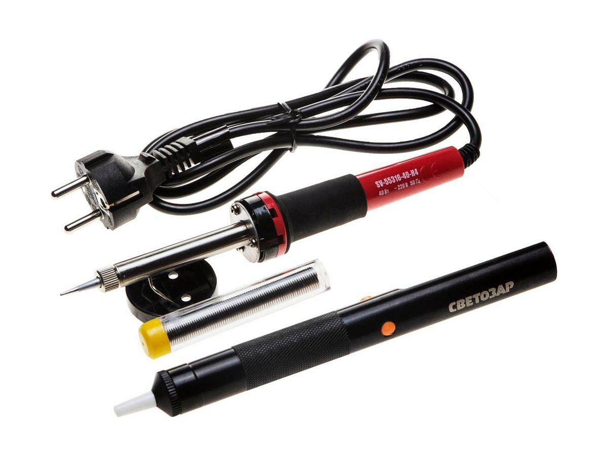 Набор для паяльных работ STAYER 40Вт с 2К рукояткой, конус, оловоотсос+подставка+припой, PROTerm (55316-40-H4)