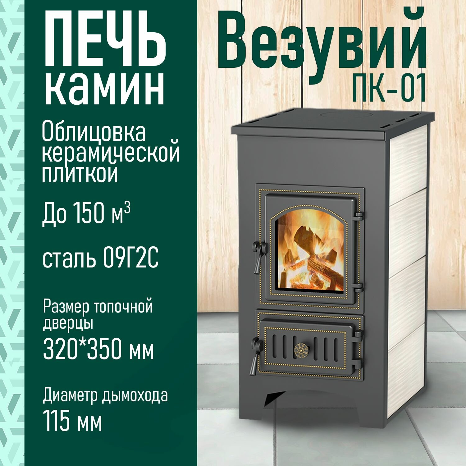 Печь-Камин везувий ПК-01 (270) талькохлорит 9 кВт (150 м3) Ø 115 мм дровяная для дома