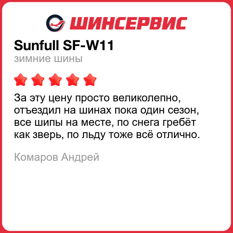 Ниже Вы можете прочитать отзывы на Шина SUNFULL SF-W11 195/65 R15 91T зимняя шипованная, ознакомится с подробными характеристиками, посмотреть интересные обзоры и фотографии на Шина SUNFULL SF-W11 195/65 R15 91T зимняя шипованная.