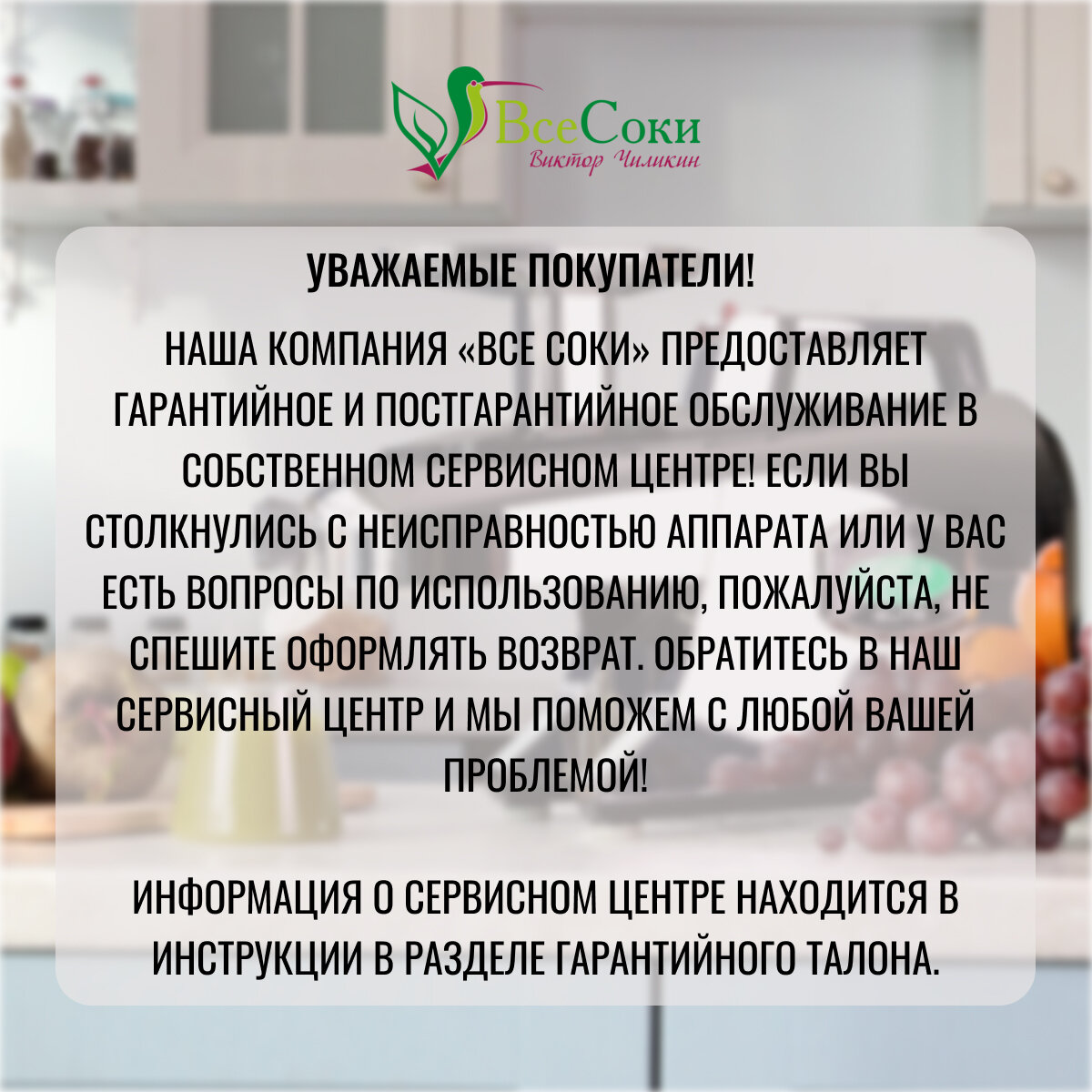 | Плюсы: | Первую неделю работала замечательно, выжил примерно около 4 литров витграсса, около 700 грамм в день по три захода. С килограмма ростков пшеницы выходило около 700 грамм сока витграсс. Но спустя неделю пошла пена, с килограмма тех же ростков получается 200 грамм сока витграсс и остальное пена. Покупал в конце декабря, отправил продавцу Все Соки в начале января сняв видео работы. Продавец после получения соковыжималки сказал что всё впорядке, Вы просто не правильно пользовались. Т.е. неделю я все делал по инструкции, но спустя 6 дней я разучился, а соковыжималка полностью исправная. На мой взгляд, у них одно желание - впарить не качественный товар покупателю, а если не работает, тебе говорят не умеешь пользоваться. Они ещё говорят о гарантии в 14 лет, нет её сразу после продажи. |