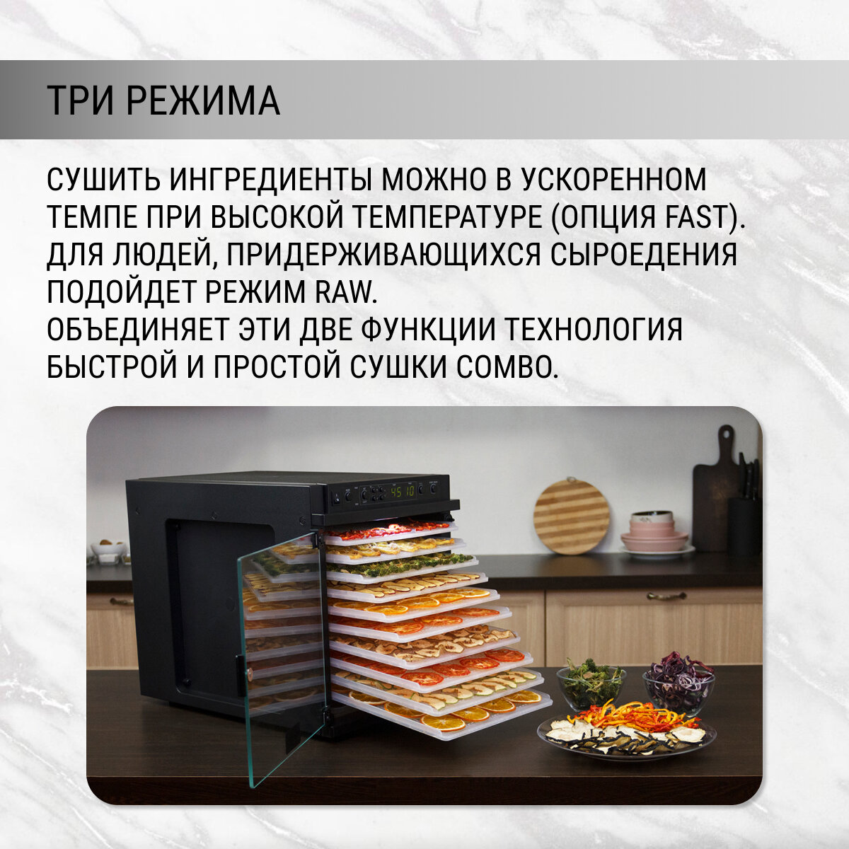 Так и оказалось! Сушит быстро и бережно, особенно с применением комбо-режима. Сохраняя витамины и прочие полезности. Приноровились также сушить на ней мясо, вялим рыбку, а в сезон яблок - очень много перерабатывали. Когда у нас её не было, много яблок приходилось выбрасывать. В общем аппарат позволяет наладить безотходное "производство"... и если вы хотите освежить и разнообразить отношения со своими любимыми... фруктами, то этот чудо-аппарат подарит вам возможность насладиться новыми, неведанными ощущениями и большим разнообразием вкусов. Вы будете удивлены на что способны привычные, уже поднадоевшие фрукты и... даже овощи. Сушите и вяльте на здоровье! |