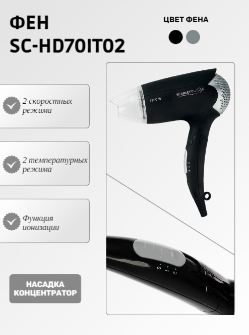 Фен SCARLETT SC-HD70IT02, 1300Вт, складная ручка, концентратор (черный)