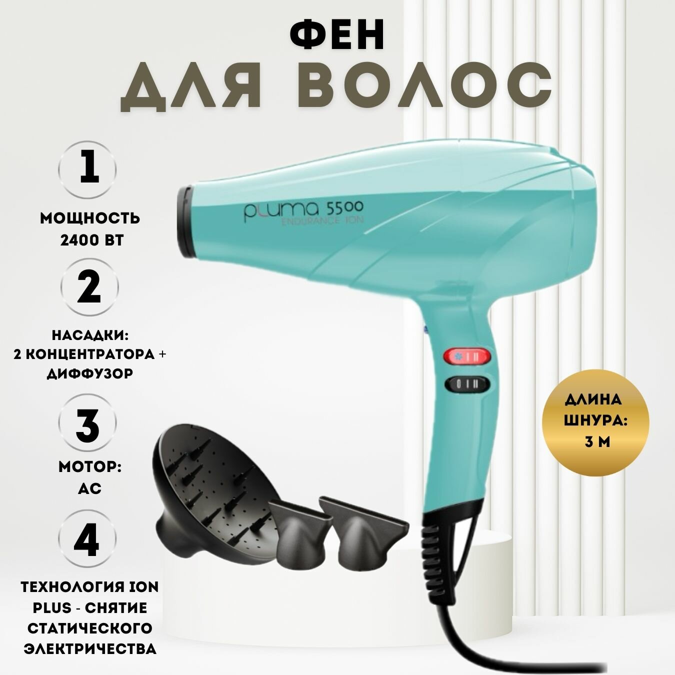 Профессиональный фен Ga.Ma Pluma 5500 Endurance Ion Turquoise