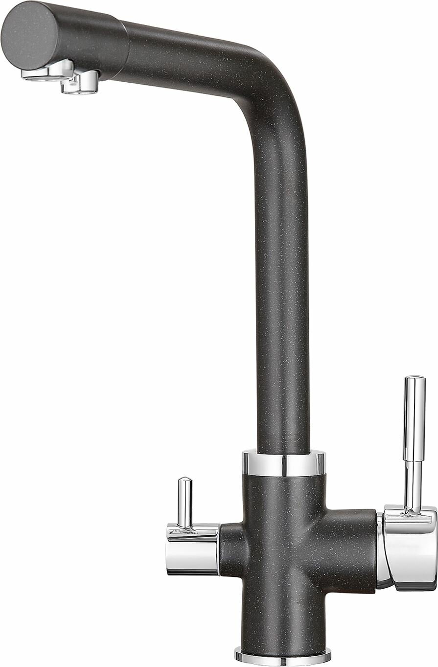 Смеситель для кухни Granula / Гранула 2015 двухрычажный с подключением фильтра питьевой воды, гибкая подводка гранит черный, высота 290мм излив 210мм / кран для раковины