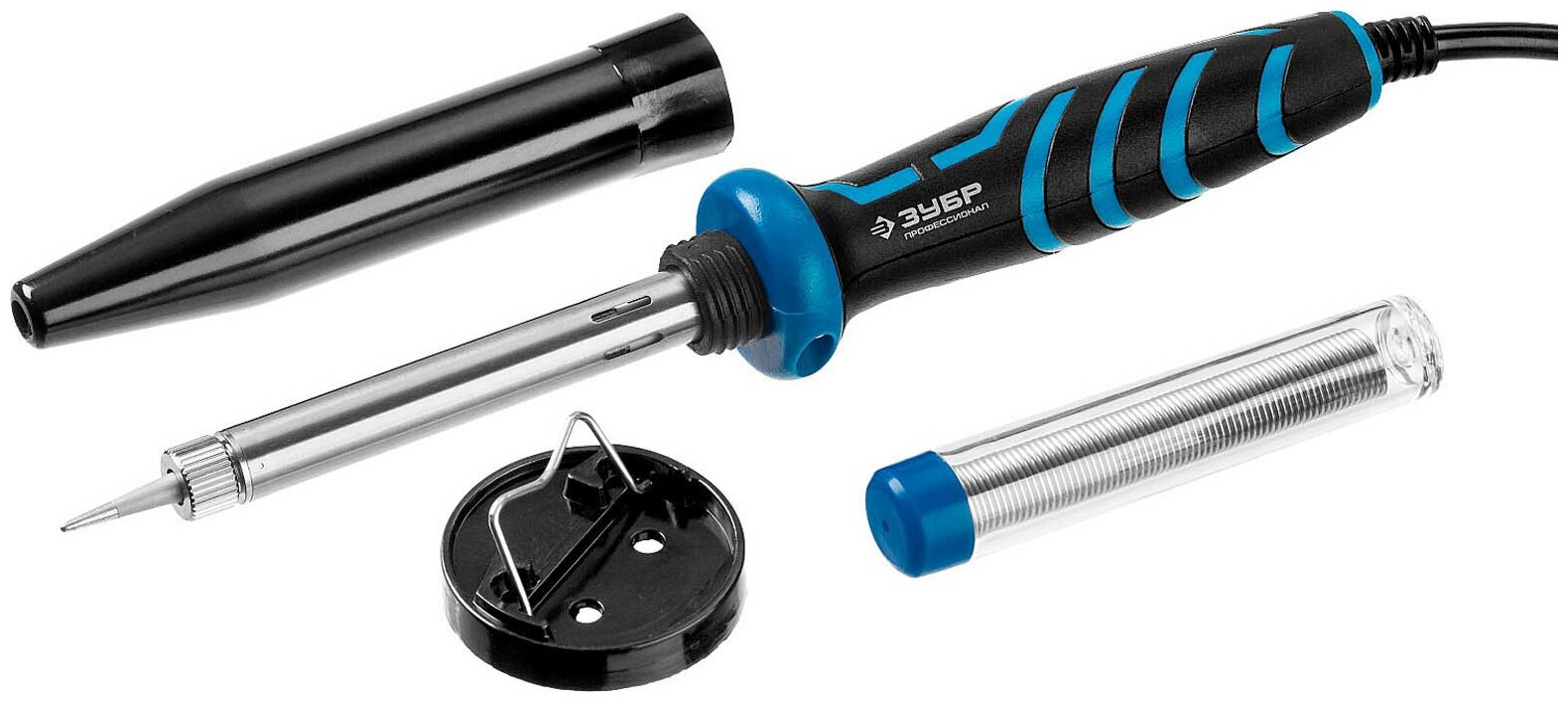 Паяльник ЗУБР "Профессионал" 55402-40_z01 с двухкомпонентной рукояткой и защитным колпачком в наборе с припоем и подставкой, 40Вт, конус