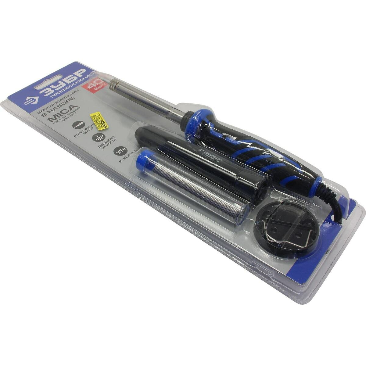 Паяльник ЗУБР "Профессионал" с двухкомпонентной рукояткой и защитным колпачком в наборе с припоем и подставкой, 40Вт, конус(55402-40_z01)