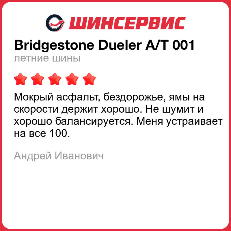 | Отзыв: | Шины выбираю как правило долго и тщательно. Советуюсь с друзьями и более опытными автомобилистами, листаю форумы. Bridgestone внушает доверие – все же, не первый год на рынке, плюс японское качество. И многие рекомендовали, говорят Bridgestone в лидерах у нас. Мой первый опыт не расстроил, шины Dueler A/T 001 показали себя отлично и на сухой, и на мокрой дороге, хоть и отзывов по ним было мало. Управляемость в дождь хорошая, и это большой плюс, ведь безопасность важнее всего. А также заметил, что шумят меньше. |