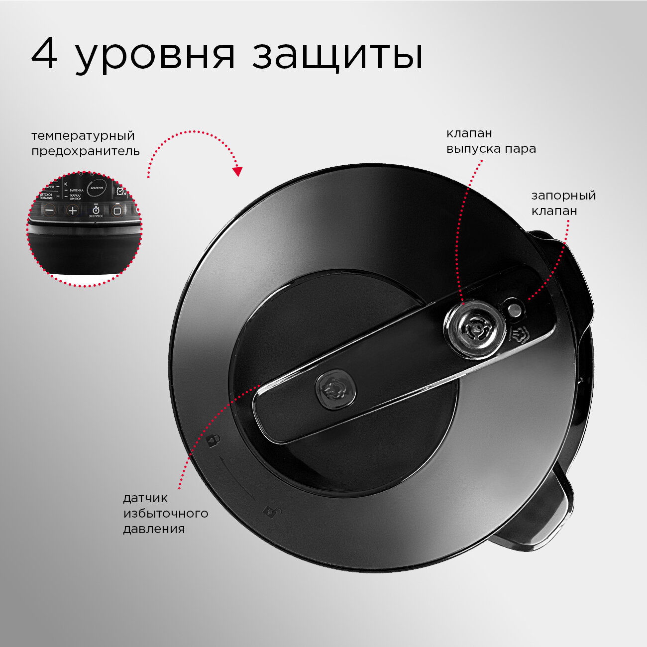 Пока не закроешь правильно крышку, клапан - не запустится, это молодцы, спасибо за безопасность. Сбрасывать пар тоже не страшно, на пальцы он не попадает никак вообще. Нормальное понятное управление, с простыми несенсорными клавишами, из-за подсветки всё хорошо видно из другого угла кухни. |