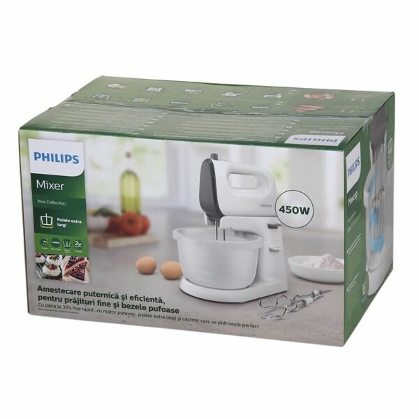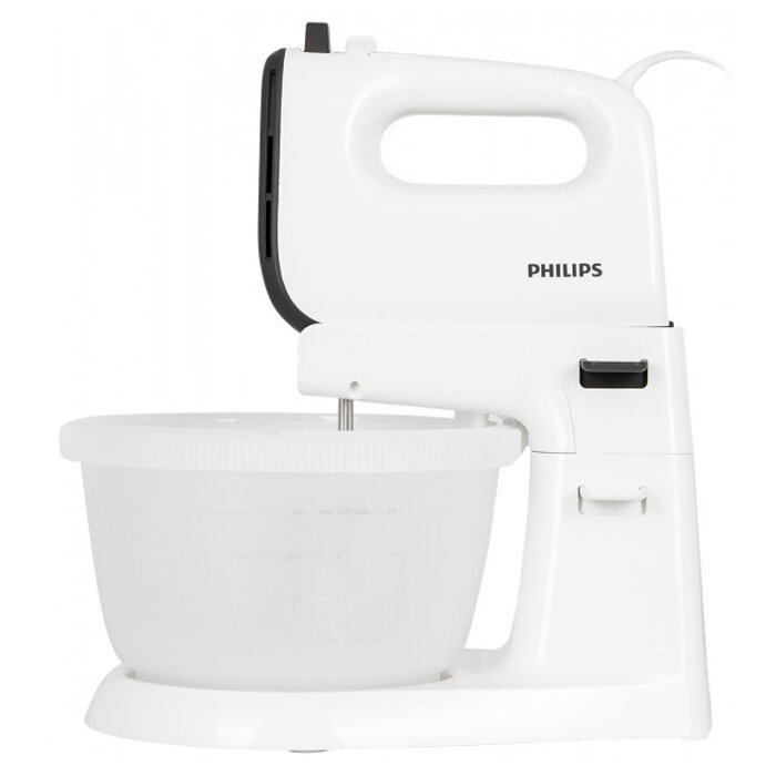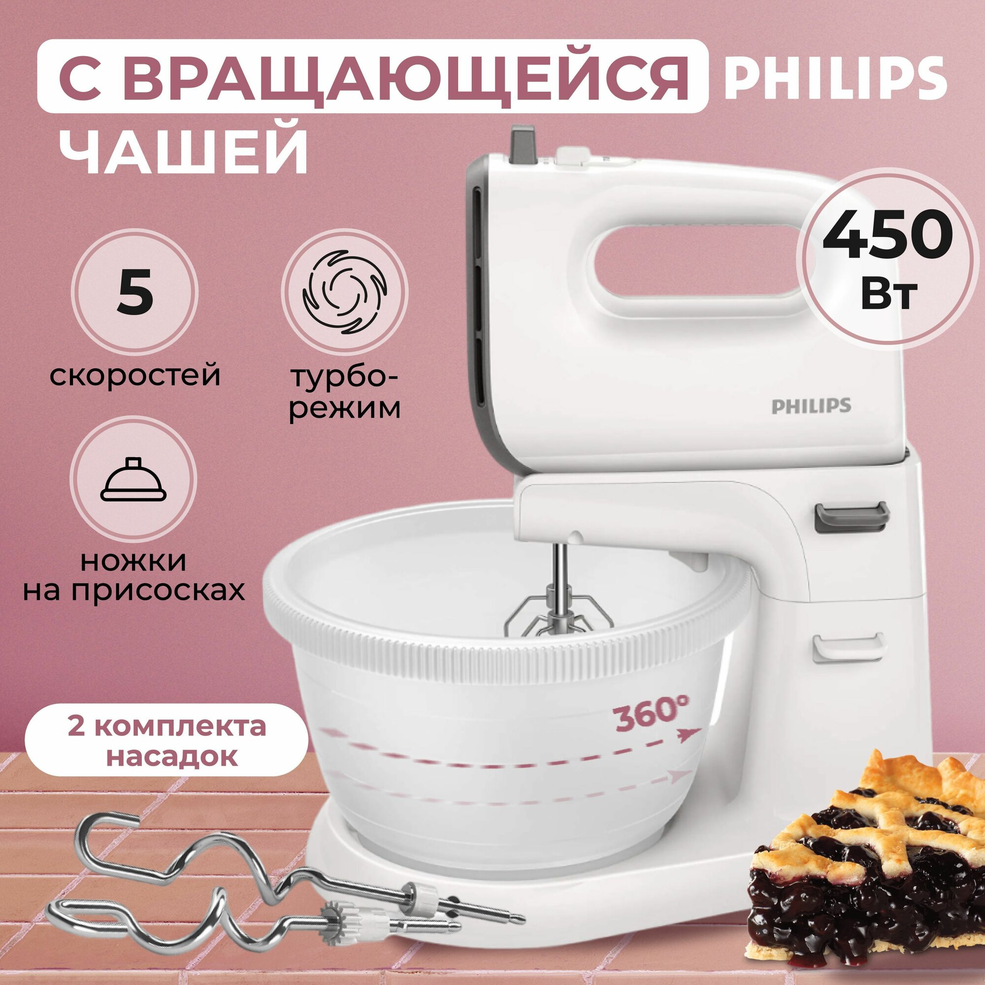 Миксер Philips/ 450 Вт, 5 скоростей + турбо режим, вращающаяся чаша, 3 л, венчики для взбивания, крюки для теста, бел