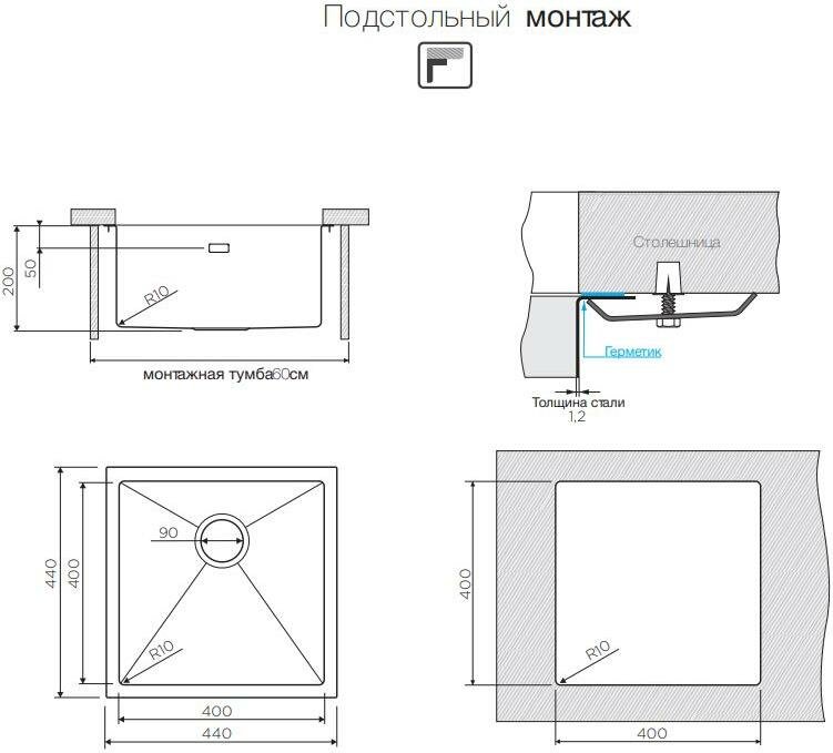 Кухонная мойка OMOIKIRI Taki 44-U/IF-IN (440 x 440 мм), врезная/вровень/подстольная, нержавеющая сталь Omoikiri 4973044